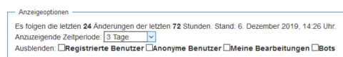 - Alle Änderungen in der Beobachtungsliste anzeigen, nicht nur die letzten (Standard): Bestimmt, ob eine geänderte Seite mehrmals im gefilterten Zeitraum angezeigt wird oder ob nur das Datum der letzten Änderung angezeit wird.
